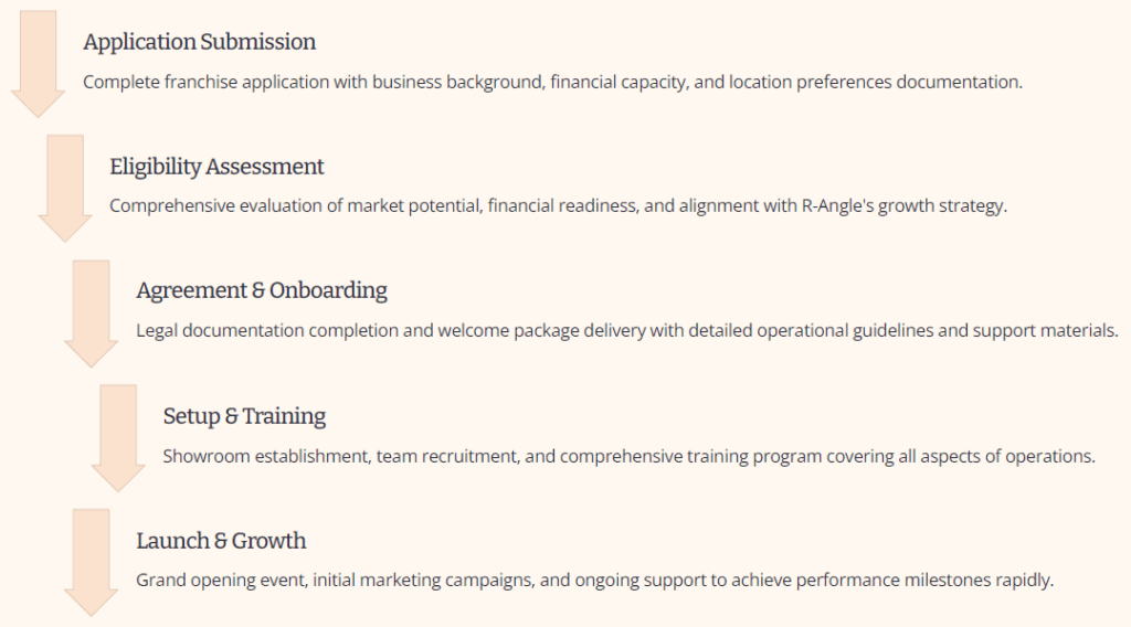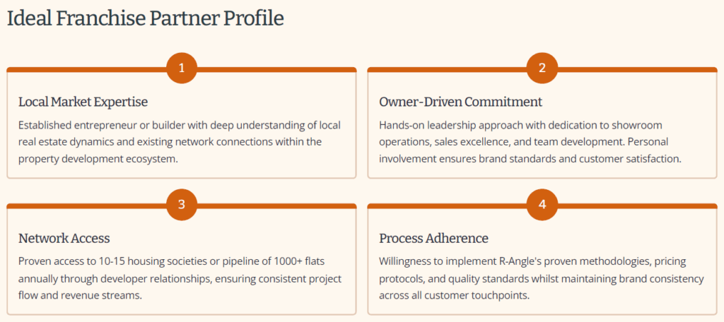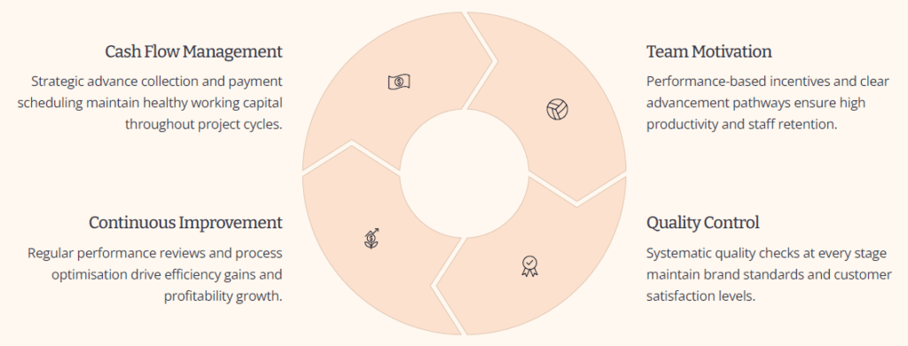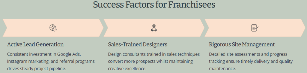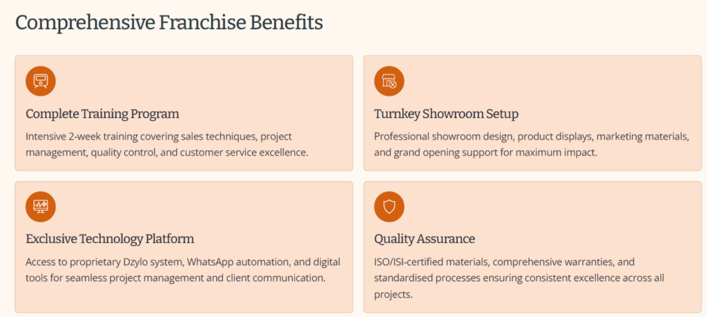Our comprehensive marketing support ensures franchisees generate consistent leads and build strong local brand recognition from day one. Digital Marketing: Google Ads, social media campaigns, and SEO optimisation Brand Materials: Professional brochures, presentation materials, and promotional content Lead Generation: Proven strategies for developer partnerships and direct customer acquisition PR Support: Media relations and local market positioning assistance