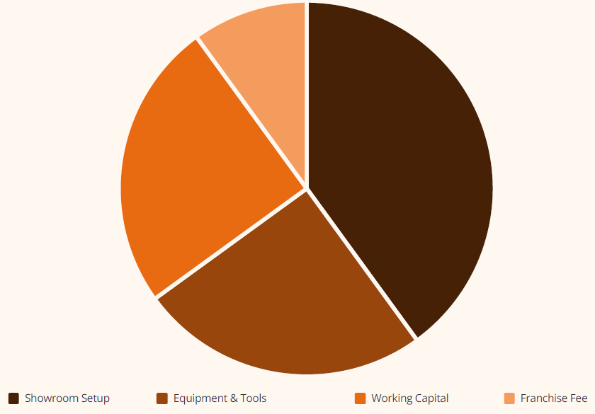 CAPEX: 10-12 lakhs for showroom, equipment, and initial setup Working Capital: 5-6 lakhs for inventory and operational expenses Franchise Fee: 2-3 lakhs for brand rights and initial training